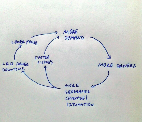 The localized network effects are built on local liquidity of supply and demand for drivers and riders. This can be best summed up by this image that Gurley features in his post.