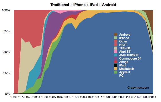 Note that this graph only looks at extensible OS platforms where 3rd party developers can easily write applications for the platform. This excludes all “dumb” platforms, including traditional cellphones and embedded devices. Dumb platform units have numbered in the billions for years.