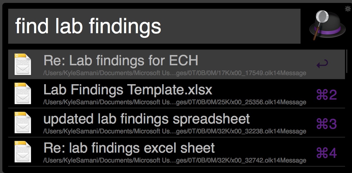 Of course, as soon as you start typing, Alfred starts searching your computer given the string of characters you’ve entered. Alfred will show you a list of matching results below the search box, as shown below. You can quickly use the arrow keys or keyboard shortcuts shown on screen to navigate to the file you’d like, and press Enter to open it. Nothing special so far, right?