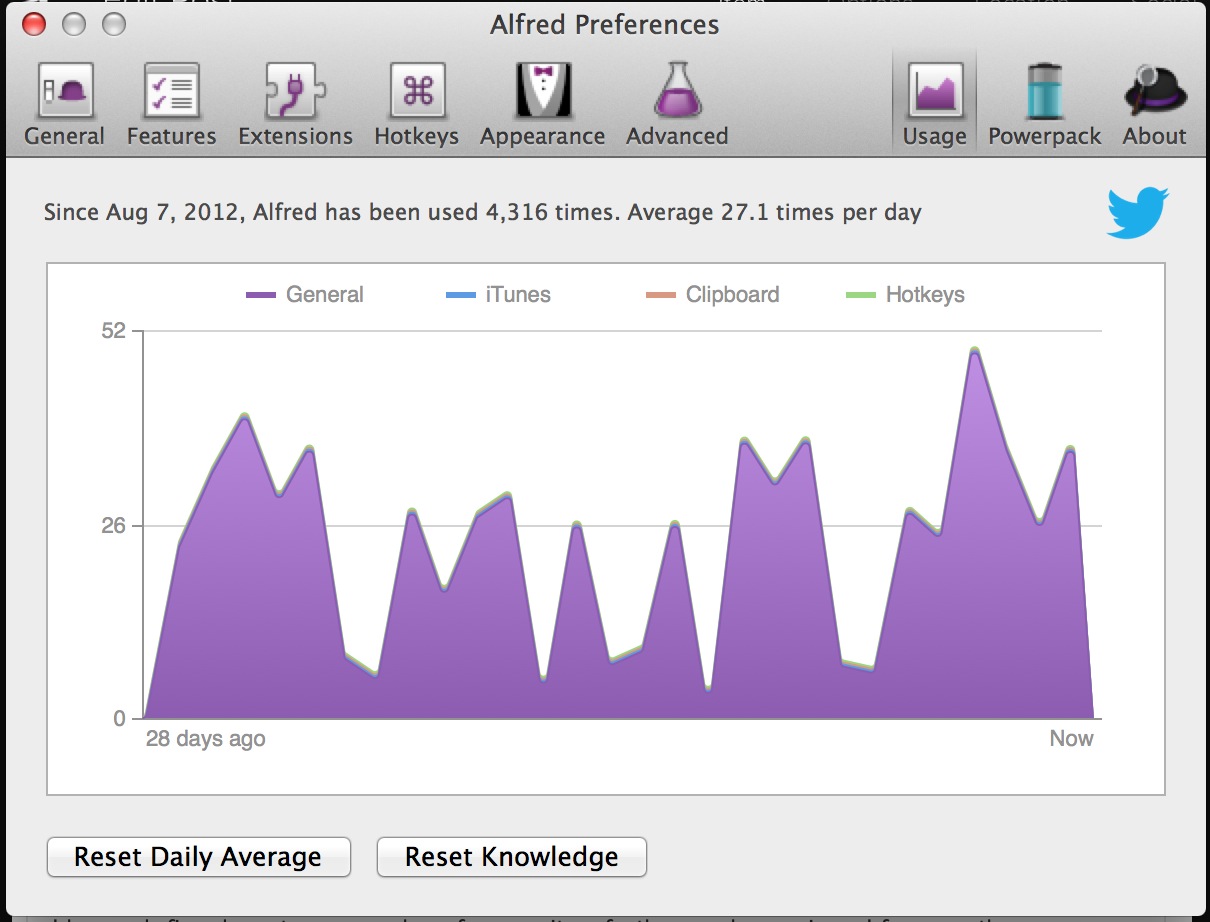 I regularly use Alfred 40-50 times/day while at work. I have on some occasions broken 100 uses in a single day = 10 times/hour = once every 6 minutes. Alfred is that good. Alfred even tracks how much you use it. As you can see, I’ve used Alfred over 4,000 times since I got my 15” Retina Macbook Pro in August 2012. Here’s my usage over the last few months. The dips represent weekends and travel.