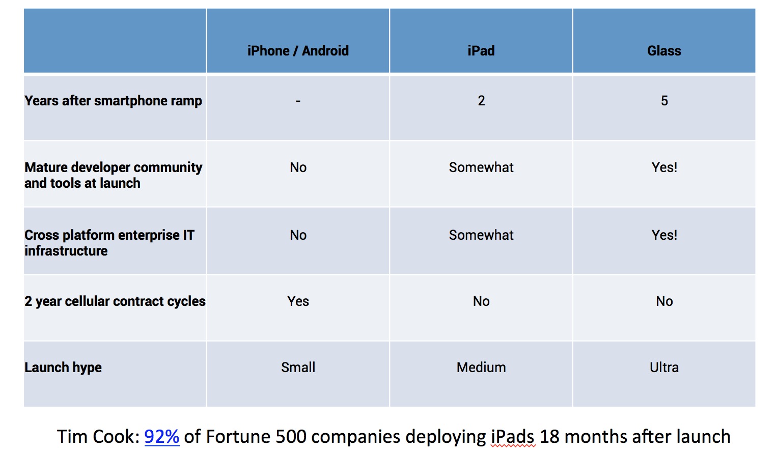 The slide above is taken from the Pristine investor deck. The thesis of the slide is that 92% of Fortune 500 companies were using iPads within 18 months of launch, and that Glass adoption will be even faster. The iPad saw incredible adoption despite the fact that: developers tools and communities weren’t that mature at launch, existing enterprise IT infrastructure wasn’t very cross-platform or Android friendly, and that the launch hype of the iPad, although significant, was less than what we’re seeing out of Google with Glass. In hype terms, Glass will be the largest consumer electronics launch of all time (iPhone 5 wins in dollar terms). It will be a spectacular show for the ages. I can’t wait :).
