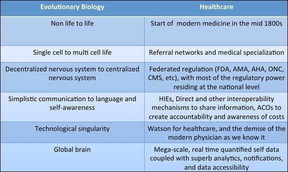 Last identifies the following meta-system changes over the past few billion years of life on Earth. Below, I’ve listed analogous transformations in healthcare delivery since the inception of modern healthcare in the mid 1800s (modern = science based, not witchcraft based medicine).